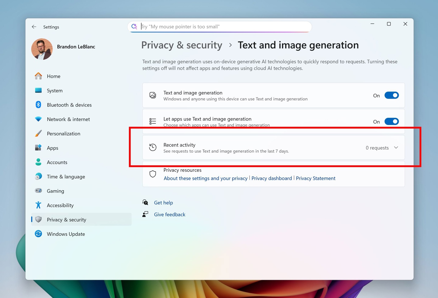 用户现在可以访问设置 > 隐私与安全 > 文本和图片生成来查看哪些第三方应用程序最近使用了 Windows 提供的生成式 AI 模型。